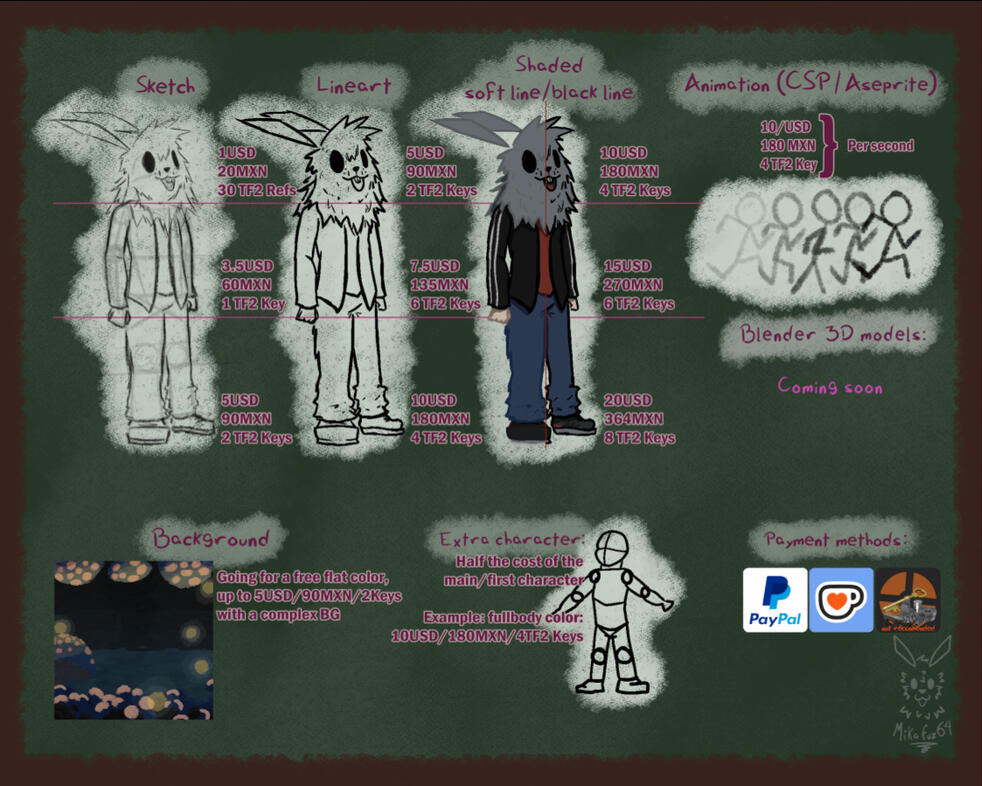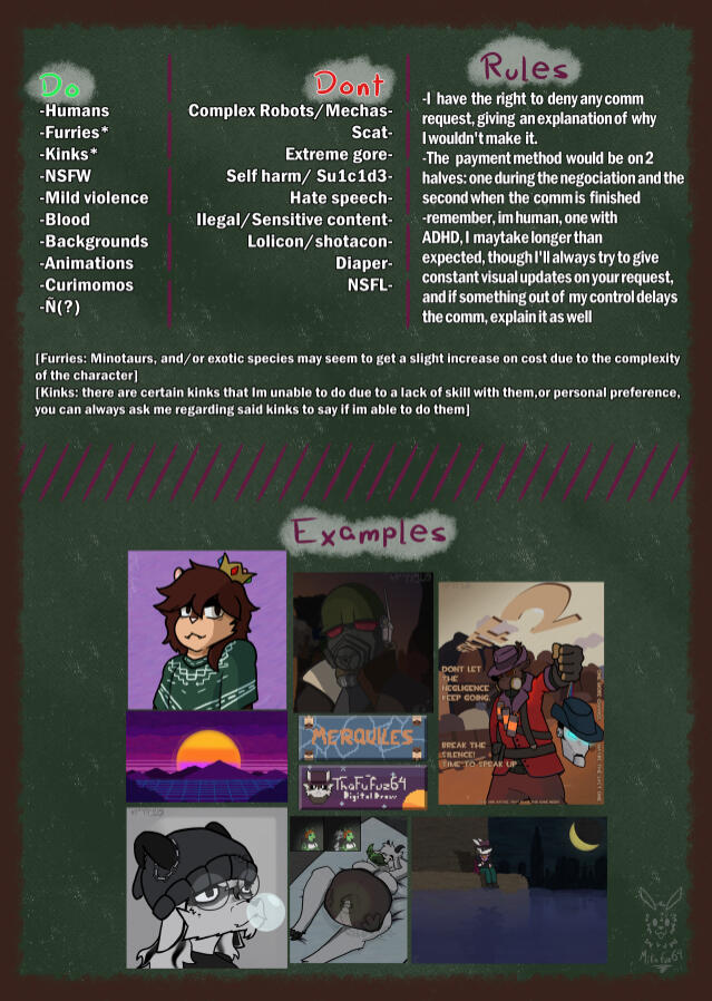 Commissions open and close from time to time, don't be afraid of asking me how many slots I have open!Ask me my paypal as well in dm's if you want to nail down a comission